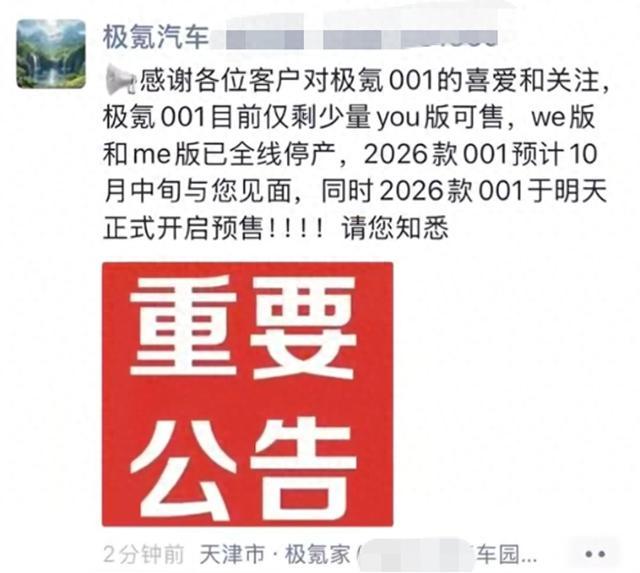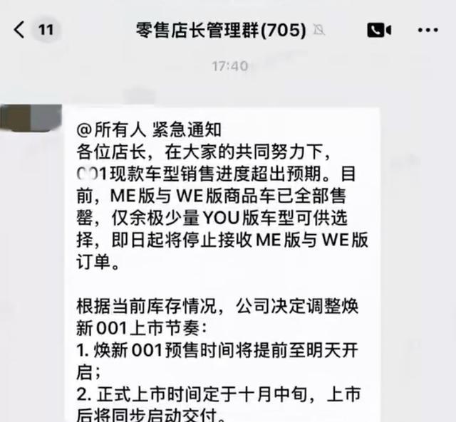 据南都报道,多个社交媒体平台流传疑似极氪内部工作群通知。内容显示,现款极氪001已售罄,极氪将提前至9月23日开启焕新001的预售,上市时间则按照原计划十月中旬,届时将同步开启交付。记者从多个门店销售及极氪处获悉,消息属实。