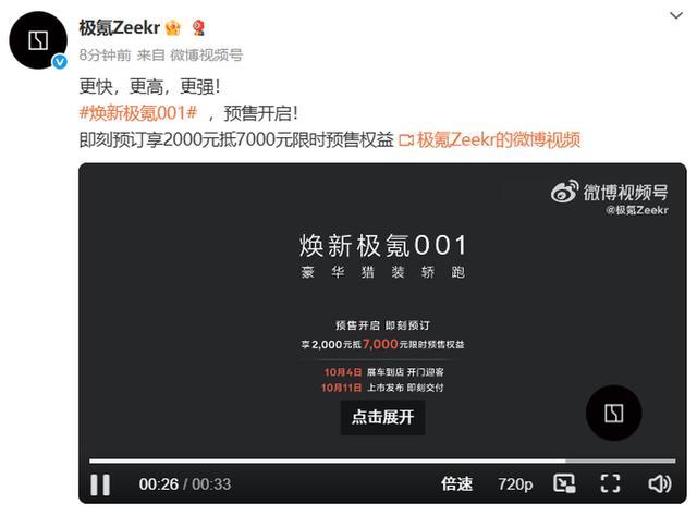 9月23日,极氪汽车官方微博宣布新款极氪001预售正式开启。