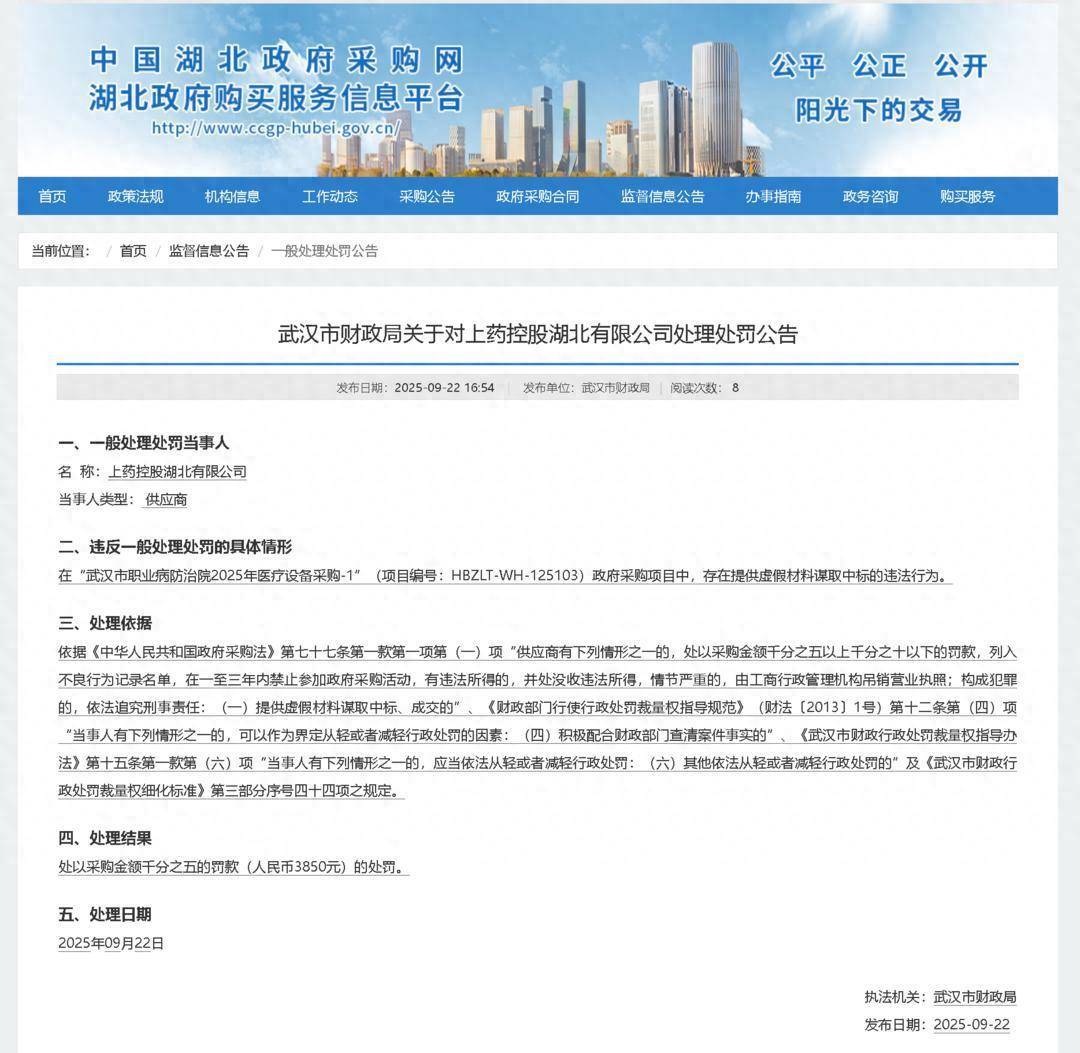 德创配资 虚假材料谋取中标!上药控股湖北有限公司被罚
